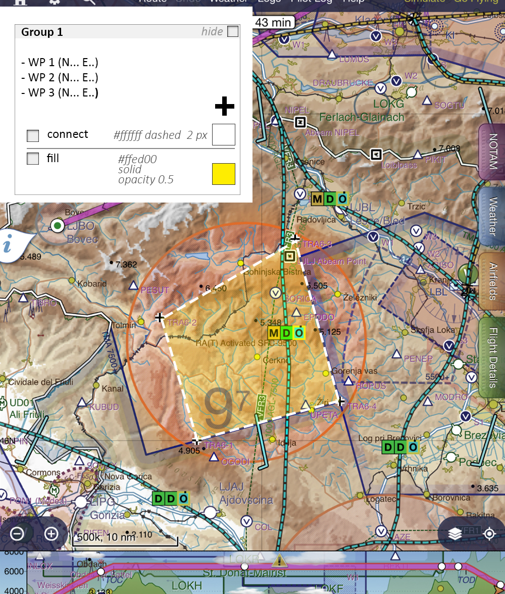 I recently planned a flight to Slovenia, where currently Adriatic Strike is taking place (after 2016 the second time now I stumbled over this problem). There are certain flight restrictions which are unfortunately not shown in SykDemon. All you can see is the red circle with the NOTAM information. I found respective coordinates at the official SloveniaControl website and simply added them as user waypoints to my SkyDemon device. I at least had the edge points that way.