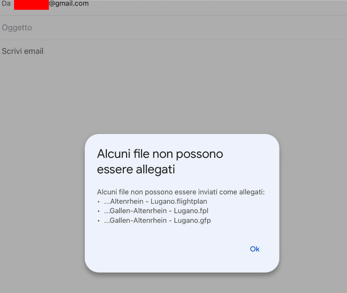 +x Fabrizio Albonico - 12/30/2023 9:50:29 PMI'm not 100% sure, but I think that it did work at one point... Anyway: today I wanted to share a route with the person I was flying with and as I had the iPad Mini 5 open I tried the "Share" functionality. Got to choose Gmail, but then the app told me that it could not add some files as attachments. Those were the *.flightplan, the *.fpl and the *.gfp files created by SD. See attached screenshot.I reckon this is likely not a SD issue, but was wondering if anyone bumped into this problem and how (if at all) it can be solved.FWIW I then shared the route by saving it to the cloud and opening it from my Android phone, where the Share function works as expected and the GMail app attaches all files.Many thanks and best regards.Fabrizio